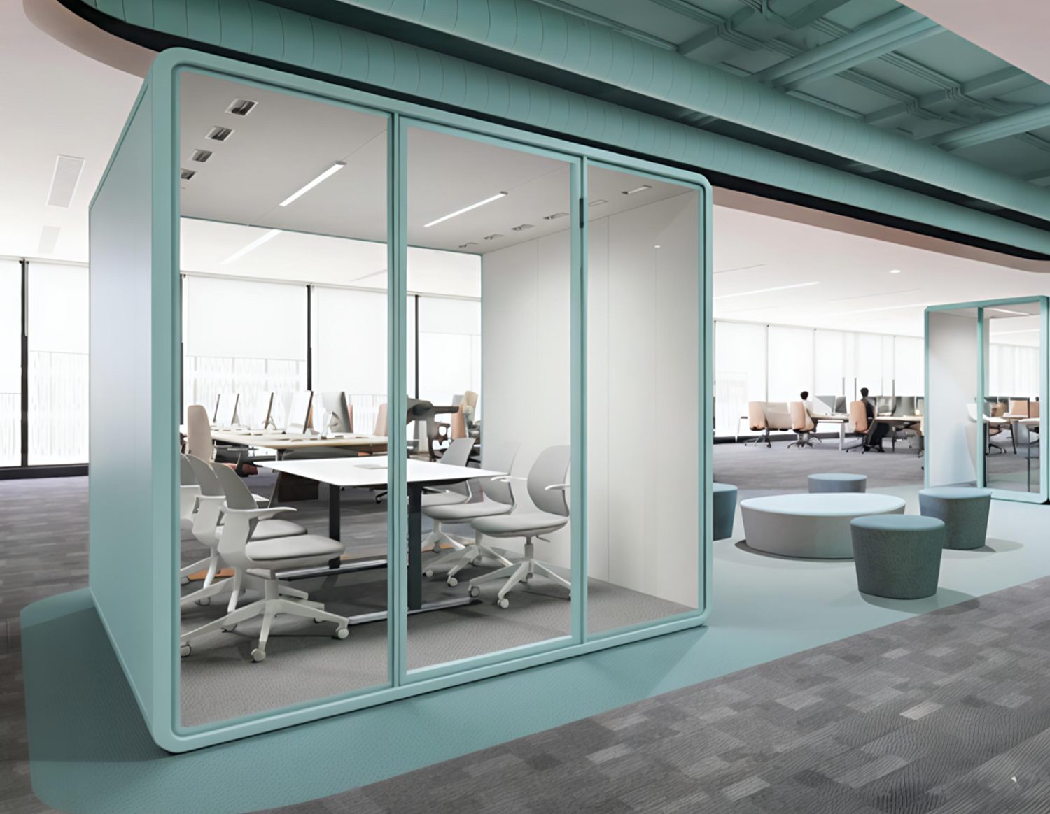 V kancelářích s otevřeným prostorem, které jsou náchylné k rušivým vlivům, je akustický modul Modupo Office speciálně navržen pro týmovou práci, delší brainstorming a soustředěnou týmovou práci. Zajišťuje soustředěné a nerušené prostředí pro všechny tyto úkoly. Pohodlně se do něj vejde 3–6 členů a nabízí tak soustředěný prostor pro specializovanou týmovou práci. Jeho vynikající zvuková izolace blokuje vnější hluk – jako je kancelářské povídání nebo zvonění telefonů – a udržuje interní diskuse v soukromí, takže týmy zůstávají soustředěné. Je vybaven multimediálními nástroji a podporuje plynulé sdílení plánů a diskuse o projektech v malých skupinách. Navíc šetří místo a čas v otevřených kancelářských prostorách, eliminuje potíže s hledáním velkých zasedacích místností a optimalizuje tak využití zdrojů. Praktické řešení pro efektivní týmovou spolupráci.